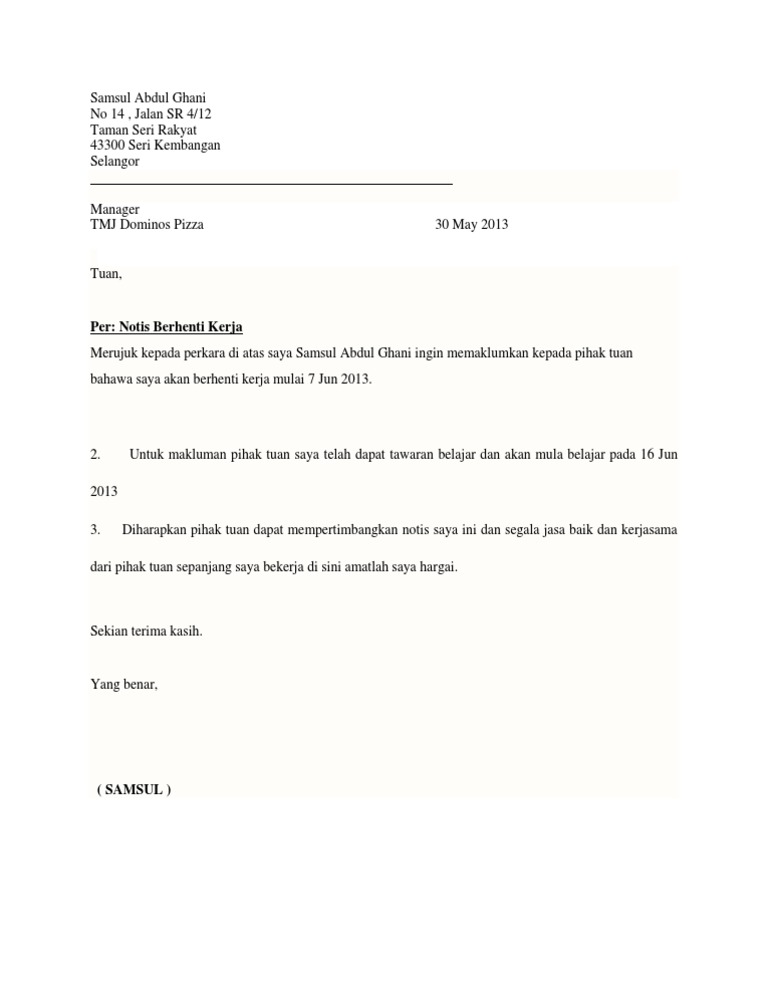 Surat ni aku create time nk berhenti kerja kilang wong engineering. Format gambar contoh surat pemberitahuan berhenti sekolah terbaru 2019. Jika perlu, boleh juga tukar format dan simpan dalam bentuk pdf untuk rujukan akan datang. Berikut dikongsikan contoh surat rasmi berhenti kerja (notis 24 jam & sebulan) dalam bm & bi the past five years have been very amazing and rewarding for me. Ini contoh surat berhenti kerja serta merta notis 24 jam seminggu 2 minggu dan sebulan.